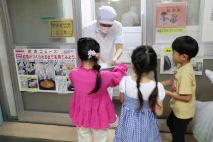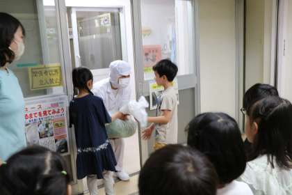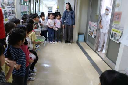 さやむきが終わったグリンピースは、みんなで給食室に届けます。