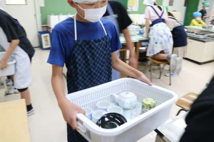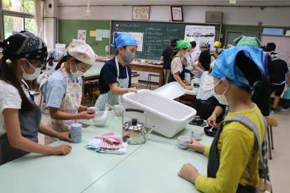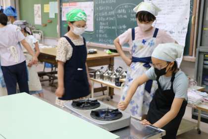 ガスコンロのガスを付けるのも、慎重な子どもたちです。道具をそろえて始めます。
