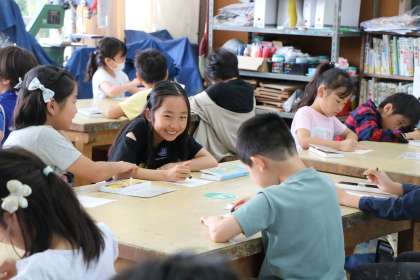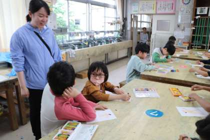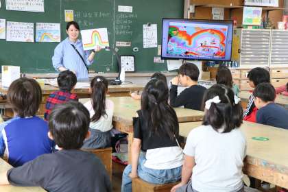 3年生図工「にじいろのせかい」の様子です。素材として描く人間の書き方を先生に教わりました。まず、服なしで、体を描いてから、服を上から描くのだそうです。そうすると、動きのある人間が描けるのだそうです。