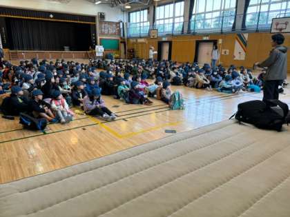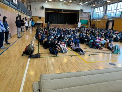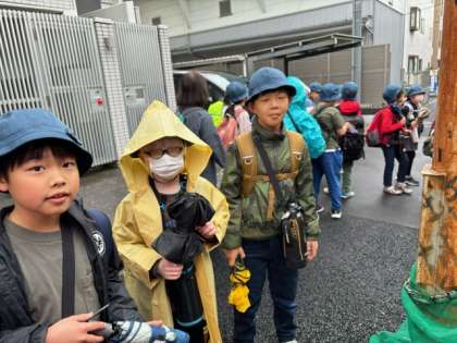 今日は3.4年生の遠足です。集合時刻に少し雨が降っていましたが、バスに乗り込む時はやんでいました。出発です!