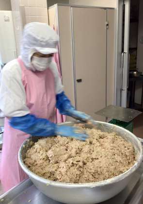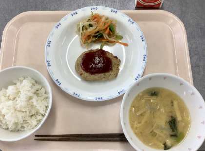 今日の給食は地場産物献立です。東京都八丈島でとれたむろあじをこどもたちに食べてもらいたいと思い、むろあじの他に、豚ひき肉、豆腐も入れて、おいしく食べやすいハンバーグにしました。