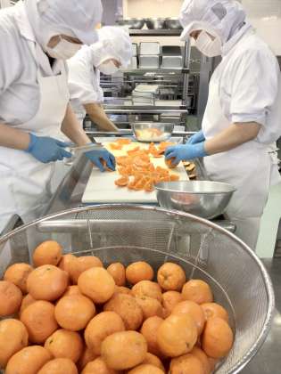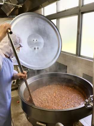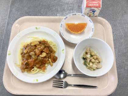 今日のスパゲッティは、えび、いか、あさりなど魚介類をたっぷり使ったトマトソースのスパゲッティです。地中海とは、ヨーロッパ大陸、ユーラシア大陸、アフリカ大陸に囲まれた海のことです。その地中海に面したイタリア、スペイン、ギリシャなどの伝統的な料理を地中海食といいます。給食では、地中海食をイメージして魚介類や野菜をにこんだ、うまみたっぷりのソースを作りました。人気のある献立です。ビーンズサラダには、ひよこ豆と白いんげん豆が入っています。