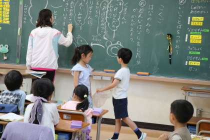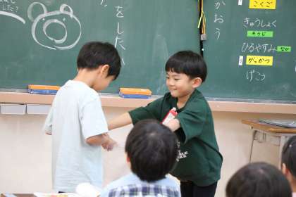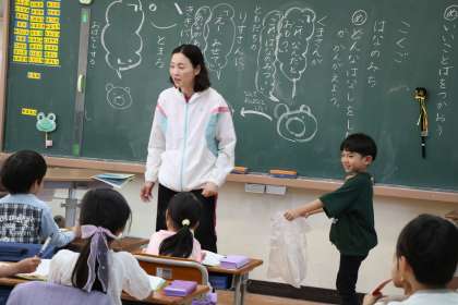 1年生国語「はなのみち」の様子です。挿絵を見ながら、お話に出てくるくまさんの行動から、場面の様子やくまさん・りすさんの気持ちを想像します。くまさんやりすさんの役になり切って、くまさん、りすさんが言うであろうセリフを考えて演じています。