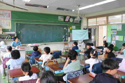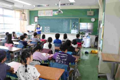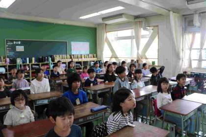 今日は放送での朝会です。看護当番の先生からのお話を、席に座って静かに聞いています。校庭で整列している時と同じように、放送でも姿勢を正しくして聞けているのが立派です。(写真は、3年生の様子です)
