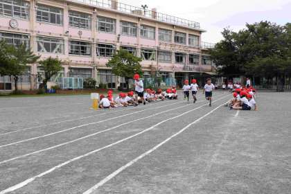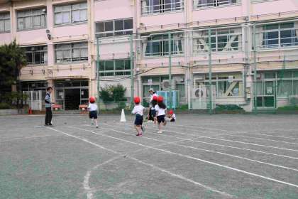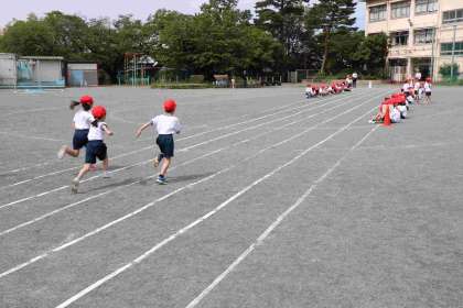 3クラス合同で短距離走をしていました。タイムを計ってみるということで、子どもたちも張り切っています。また、見ている他のクラスの友達からも「がんばれー!」の声がたくさん聞かれたのがすてきでした。