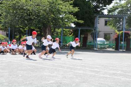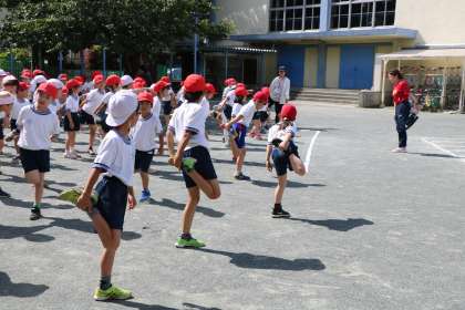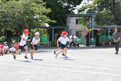 2年生学年体育の様子です。しっかり準備運動をして、50メートルに挑戦です。