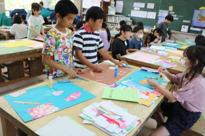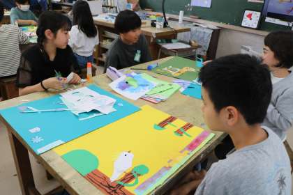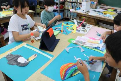 4年生図工「エリックカールさんになって」の様子です。自分が好きな動物をテーマにコラージュ技法を使って絵に表します。全体の色やバランスを考えながら作品を創っています。すてきな作品が仕上がっています。