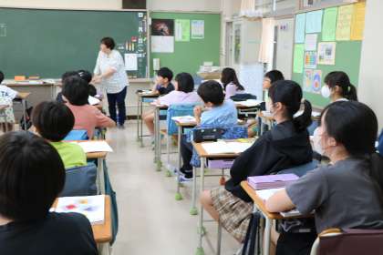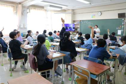 体を発表者の方に向けて、手を止めて、しっかり顔を向けて聞いています。こんなに真剣に聞いてくれるということは発表している子も安心して自信をもって自分の考えが言えます。そしてどちらか一方の学級がすごいのではなく、どちらの学級の子もいる授業でそれができている、6年生全員がそのような姿勢だというところがすごい!と思います。