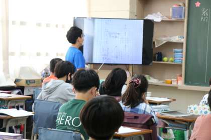 6年生算数「分数のわり算」の様子です。砧小学校では3年生以上の算数は学級数+1のグループに分けて、少しでも少人数で学習をしています。写真のクラスは、6年生の各クラスから集まっている子どもたちが勉強しています。一人の子が自分の考えを発表しているとき、クラスにいる子たちが真剣に聞いている様子にびっくりします。