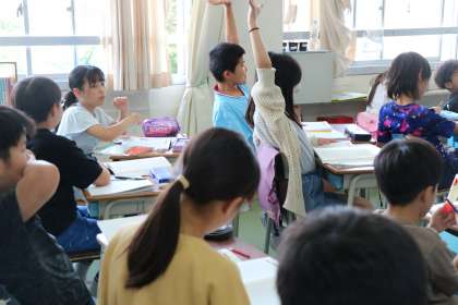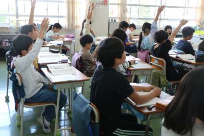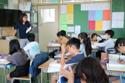 5年生国語「見立てる」の学習の様子です。それぞれの段落で書かれている内容をおさえ要旨をまとめます。真剣に集中して取り組んでいます。