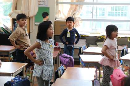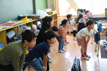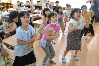 音楽「チェッコリ」の様子です。この歌は、歌に合わせて踊りもついています。動画を見ながら何回も、そしてスピードを増しながら歌ったり踊ったりとっても楽しそうです。