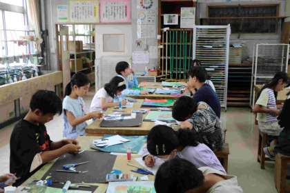 図工では、絵を描き終わった後、自分の作品をより良いものにするために、回り(額縁)を工夫する活動をしていました。