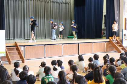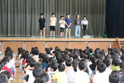 金曜日の朝は集会・朝会があります。今日は集会委員会による「まちがいはどーこだ集会」です。舞台の上の集会委員がある場面の様子を表現しています。幕を閉めて次に開けたときどこが違うか当てるクイズです。