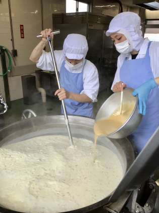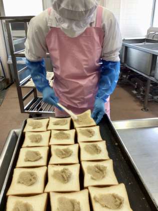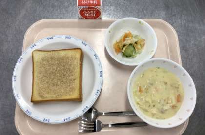 写真は、食パンにすりごまとバター、砂糖を混ぜたものを塗っている様子です。この後、オーブンで焼いてセサミトーストを作ります。。次の写真は、スープに手作りのホワイトルウを入れている様子です。クラムチャウダーは、あさりが入ったクリームスープでこどもたちから人気があります。今日のサラダのドレッシングは、すりおろしたたまねぎとりんごが入っています。さわやかな酸味がおいしいサラダです。