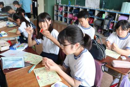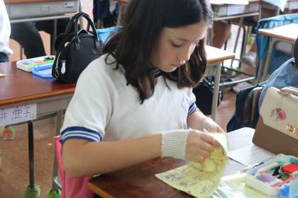 5年生家庭科の様子です。担任の先生も一緒に裁縫に挑戦です。