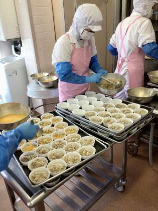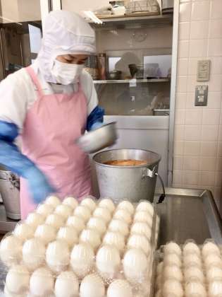 砧小学校全員分の卵焼きで使う卵の量は全部で約700個です。調理室でひとつひとつ手で割ります。