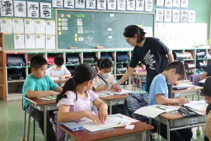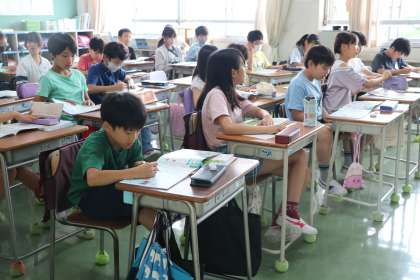 角度の学習をしています。分度器もよく見ると0度の線が分度器の一番下か、少し隙間があるかの2種類あります。よく見ないと、どの部分を測り大戦の上に置くかで測り方が違ってきます。先生がまずはその分度器の違いから丁寧に説明してくれたので、どの子もスムーズに測定ができました。