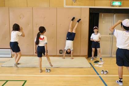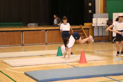 5年生体育「マット運動」の様子です。それぞれ自分の課題に合った場を選び練習をしています。互いに動きのコツについて声を掛け合ったり、「すごい!できたよ!」と称賛したり、学びあっている姿が高学年らしい姿です。