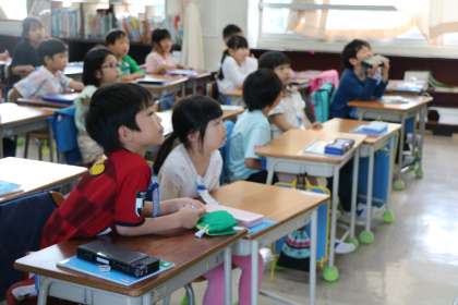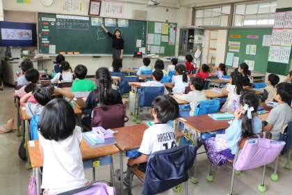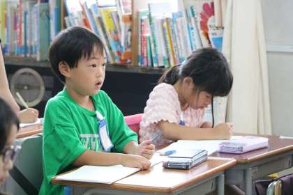 1年生算数「あわせていくつ ふえるといくつ」の学習の様子です。絵を見ながら合わせていくつになることは何度も確認し、学習してきました。いよいよしきにする学習です。ノートの使い方も先生から丁寧に教えてもらい、できるようになっています。