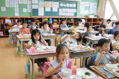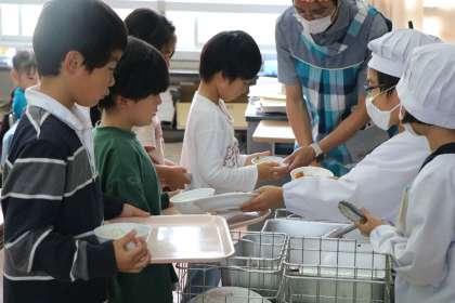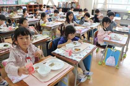 さて1年生は給食準備・後片付けを頑張っているでしょうか。教室の様子を見に行くと、落ち着いてそして静かに全員で準備を頑張り、いただきますもできていました。今日は魚や五目豆でしたが、箸の使い方も上手です!