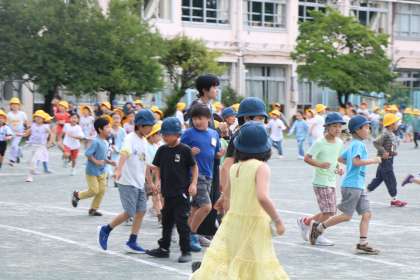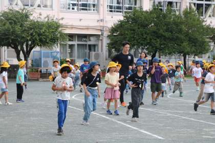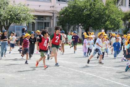 今日は1・2・3年生のランランランです。友達や先生と一緒に、自分のペースを大切にしながら走ります。赤いビブスを付けて走っている子は高学年の運動委員会の子たちです。一緒にはげんしながら走ることを昨日の委員会で提案し、早速取り組んでいるそうです。高学年の走りを見て、さらに頑張れる子もいることでしょう。