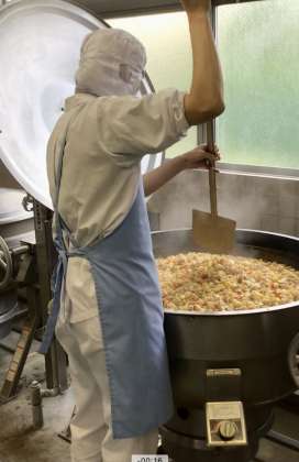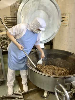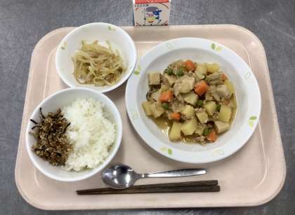 6月4日から10日は歯と口の健康週間です。6月の献立では、よくかんで食べることを意識できる「かみかみ献立」を入れています。6月4日の虫歯予防デーに合わせて「かみかみ佃煮」を作りました。じゃこと、ごま、塩こんぶ、かつおぶしを合わせて、甘辛いたれにからめて作りました。かみしめるとうまみをたっぷり感じられる佃煮です。こどもたちからも人気のある献立です。肉じゃがには、刻んだ大豆と高野豆腐も入れて栄養たっぷりの煮物にしました。