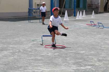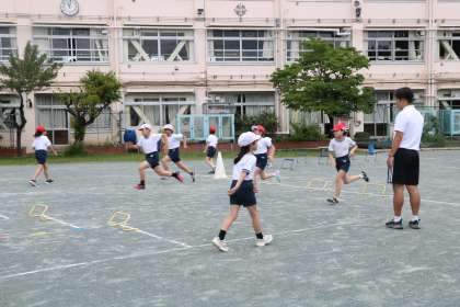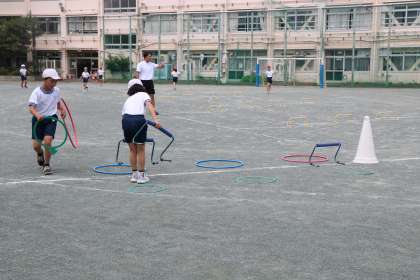 今日のめあて「自分に合ったインターバルを見つけよう」を確認し、自分に合った・・・ということはどういうことか?50メートル走のタイムに近いタイムで走り切れるということだと知り、授業の最後にタイムを測って確認しようということになりました。