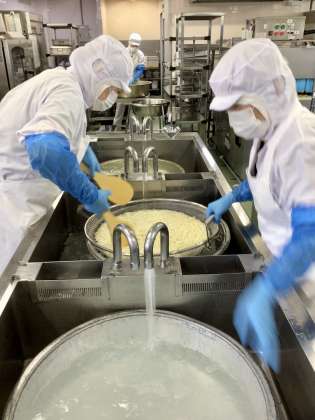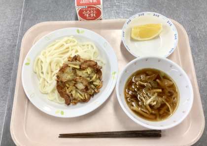 今日のつけめんもそのひとつです。うどんをゆでてから、何回も水をかえてうどんを冷やします。直前にうどんの上に氷をのせてクラスへ届けます。つけるつゆは、かつおとこんぶでとっただし汁に肉や野菜、油揚げをたっぷり入れて、塩分ひかえめにして作ります。