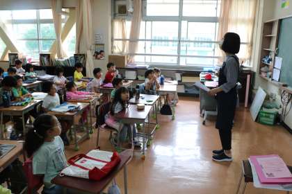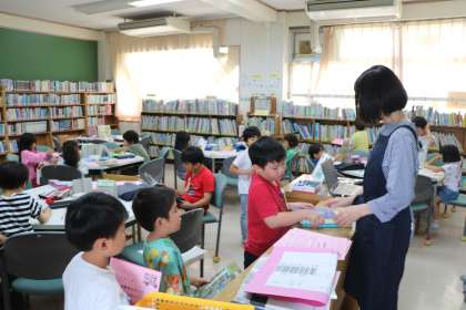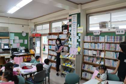 1年生図書の様子です。机の上に図書バックを置いて、図書室の司書の先生のお話を聞いています。今日は初めて図書室の本を借りられます。好きな本を選んでカウンターにもっていきバーコードを読み取ってもらうと借りる手続きは完了です。1週間に2冊本を借りられるので、これからたくさんの本に触れてほしいと思います。