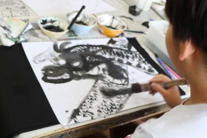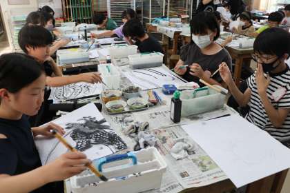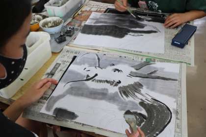 6年生図工「私の龍」の様子です。墨や紙の特徴を生かして墨絵に挑戦しています。