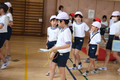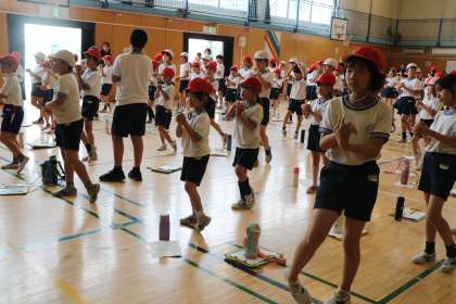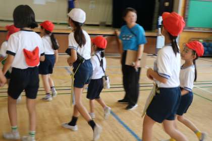 2時間目は2年生の体力テストです。優しい5年生が補助しながら5種目測定します。