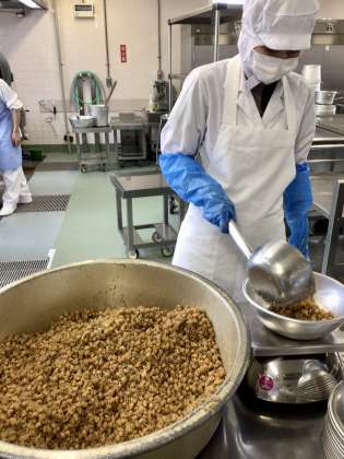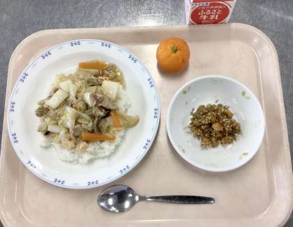 6月の給食のめあては「よくかんで食べよう」です。今日のかみかみ献立は「大豆とじゃこの甘辛揚げ」です。油で揚げたじゃこと大豆に甘辛いたれをからめてあります。こどもたちから人気のある献立です。