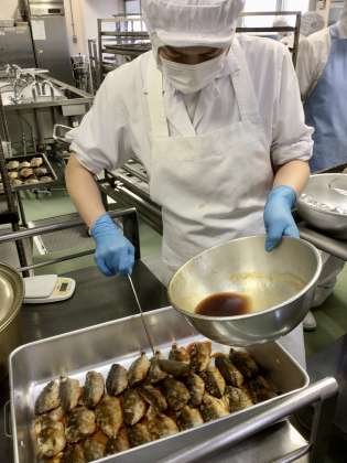 今日は雑節のひとつ、「入梅」です。入梅は暦の上での梅雨入りです。入梅の時期は、ちょうど梅の実が熟し始める頃です。今日の給食は入梅に合わせて梅干しを使った献立にしました。今が旬の鯵を焼いて、上からかつおだしと梅干、しょうゆ、みりん、さとうを合わせたソースをかけました。じめじめした季節にぴったりの魚料理です。