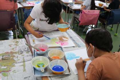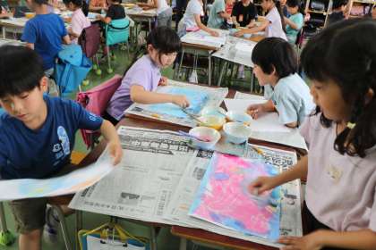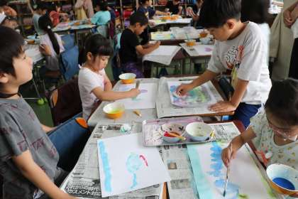 2年生図工の様子です。白いクレヨンで線描きしたところが、薄い絵の具にはじいて浮かび上がってくるようです。