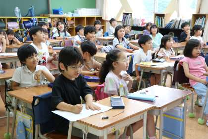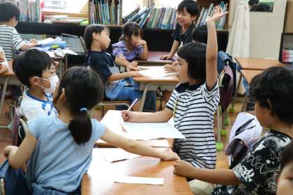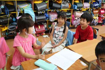 1年生こちらのクラスは、班ごとに分担して、全員で言葉遊びの詩を作っています。友達同士上手に相談して一つの詩が完成しました。みんなで声をそろえて読むと楽しいです。