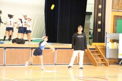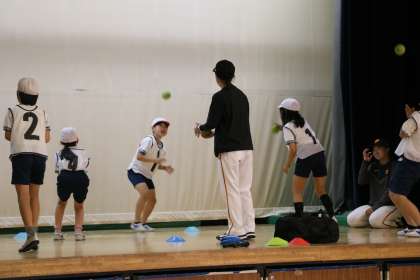 ボールの投げ方、取り方、野球の簡単なルールなどを教えていただき、最後には攻守に分かれてゲームをしました。