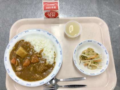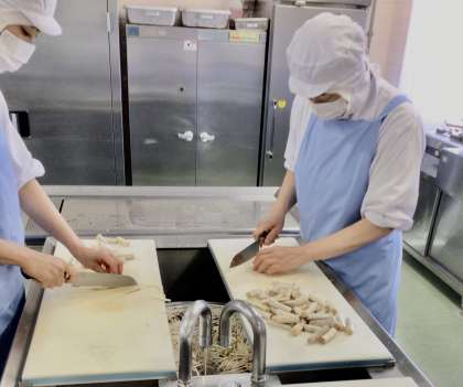 毎月19日は「食育の日」です。食育は、生きるうえでの基本であって、知育、徳育、体育の基礎となるものです。ぜひこの機会に自分の生活を振り返り、「食」について考えてみましょう。今日のかみかみサラダは食物繊維の多いごぼうが入ったサラダです。かみごたえが出るように、繊維にそって給食室ですべて包丁で千切りにしました。