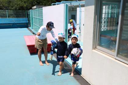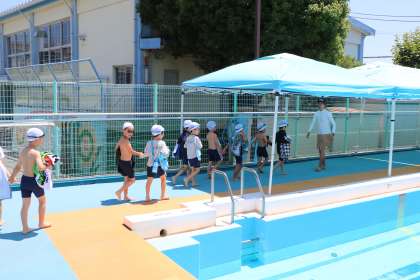 今日はとってもいい天気のもと、1年生初めての水泳学習でした。まず初めにプールサイドに入る前に足を洗います。うきうきする気持ちもあることでしょうけれど、持っているタオルを落とさないように、走らないで落ち着いて歩きます。