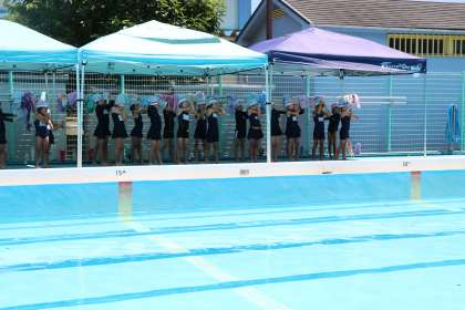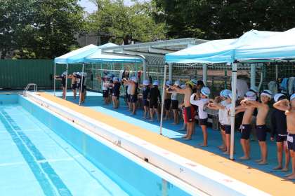 プールサイドに男女別で並んでいます。先生のお話をしっかり聞いて行動しています。1年生立派です!