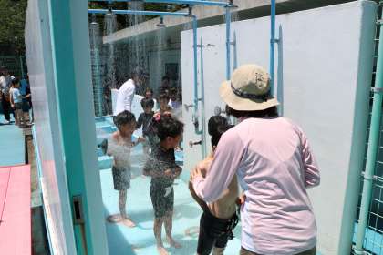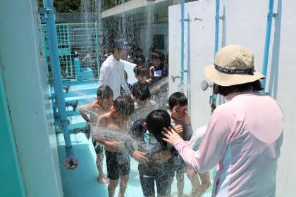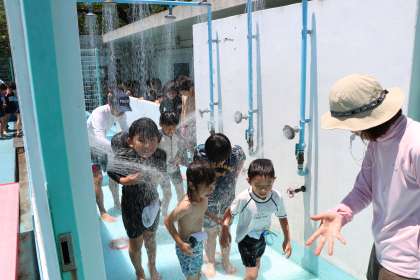 バディーを確認したらシャーです。帽子を取って頭・顔・体・・と十分に濡らして汗を洗い流し水に慣れます。