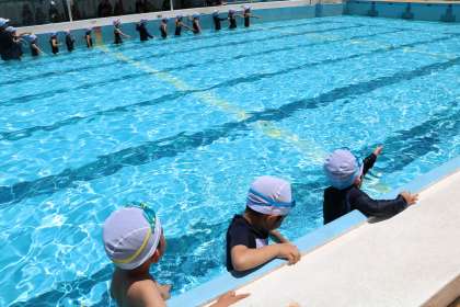 プールに入ったら片手でプールサイドをつかんで先生の方におへそを向けます。