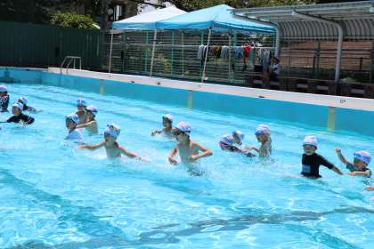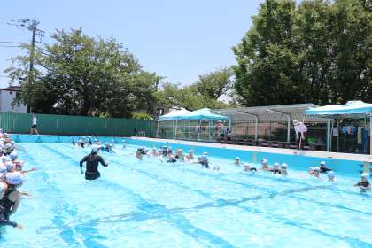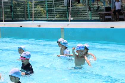 プールの中で歩いたり駆け足をしたりたくさん動いて、水と仲良しになりました。
