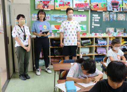 今でも仲良しの1年生時元担任の先生たちも子どもたちの成長を楽しみに参観しています。あら、子どもたちへの応援の気持ちでしょうか3人おそろいの・・・。