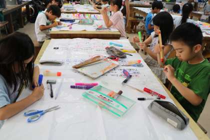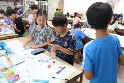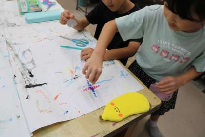作品が完成した子は、国語の学習で作り方などを学習したことと関連付けて、コマを実際に作っています。形や色を工夫して次々アイディアが浮かぶよう、試行錯誤しながらおもしろコマやカラフルコマを作っていました。