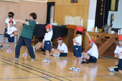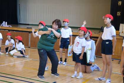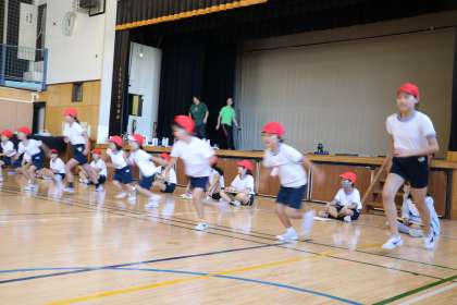 1・6年生体育、体力測定のシャトルラン(持久走)の測定の様子です。6年生の先生が1年生に一人一人どの6年生に向かって走っていけばいいか確認してスタートです。