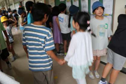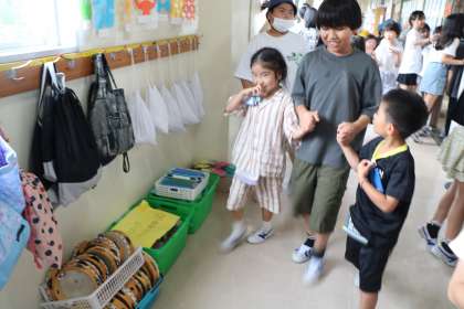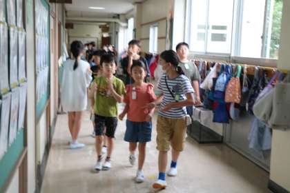 まず最初に4年生が1年生を迎えに行きます。外で活動する班もあるので、4年生は自分の靴をもって迎えに行きます。