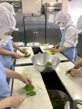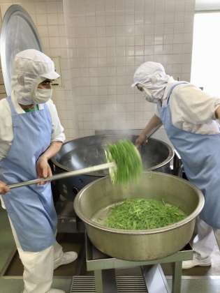 今日の給食は夏が旬のピーマンをたっぷり使ったチンジャオロース丼です。ピーマンは、ビタミンⅭが豊富で、種やわたに含まれるピラジンには、血液をさらさらにする効果があります。今日の給食で使ったピーマンは約370個ありました。その370個のピーマンはすべて調理員さんが包丁できれいな千切りにして、別の釜で色よく炒めています。