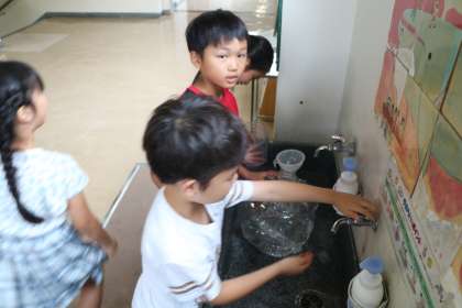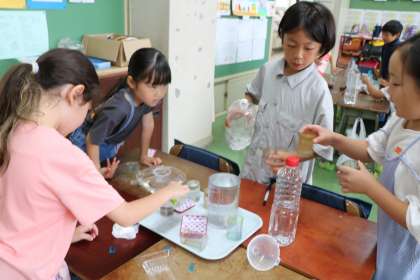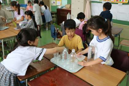 2年生算数「水のかさ」の学習です。家から持ってきた容器はどのくらいの水が入るか、班ごとに量ります。dlやLマスの使い方にも慣れてきたでしょうか。