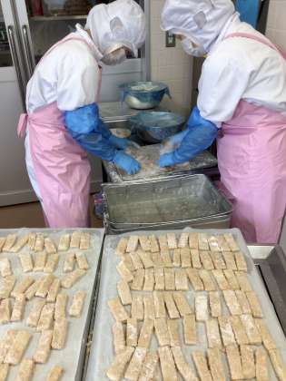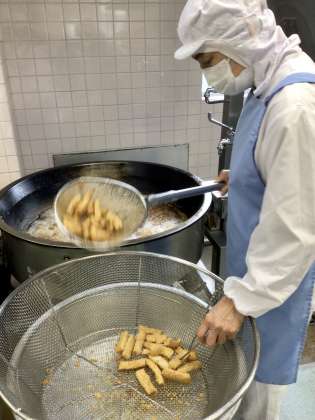 いかのスパイス揚げは、米粉と片栗粉にオールスパイスとパプリカを混ぜあわせた粉をつけて油で揚げました。こどもたちに人気のいか料理です。