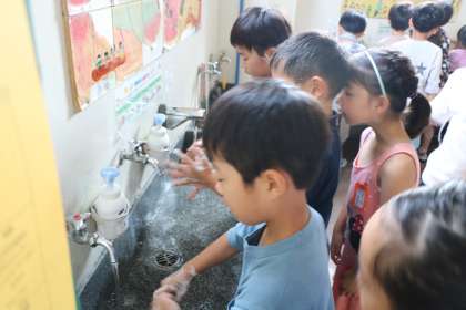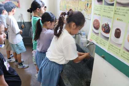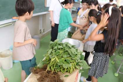 2年生食育の一環で、枝豆のさやもぎをします。まず丁寧に手を洗って準備をします。こんなにたくさんの枝豆!ビックりする子どもたちです。